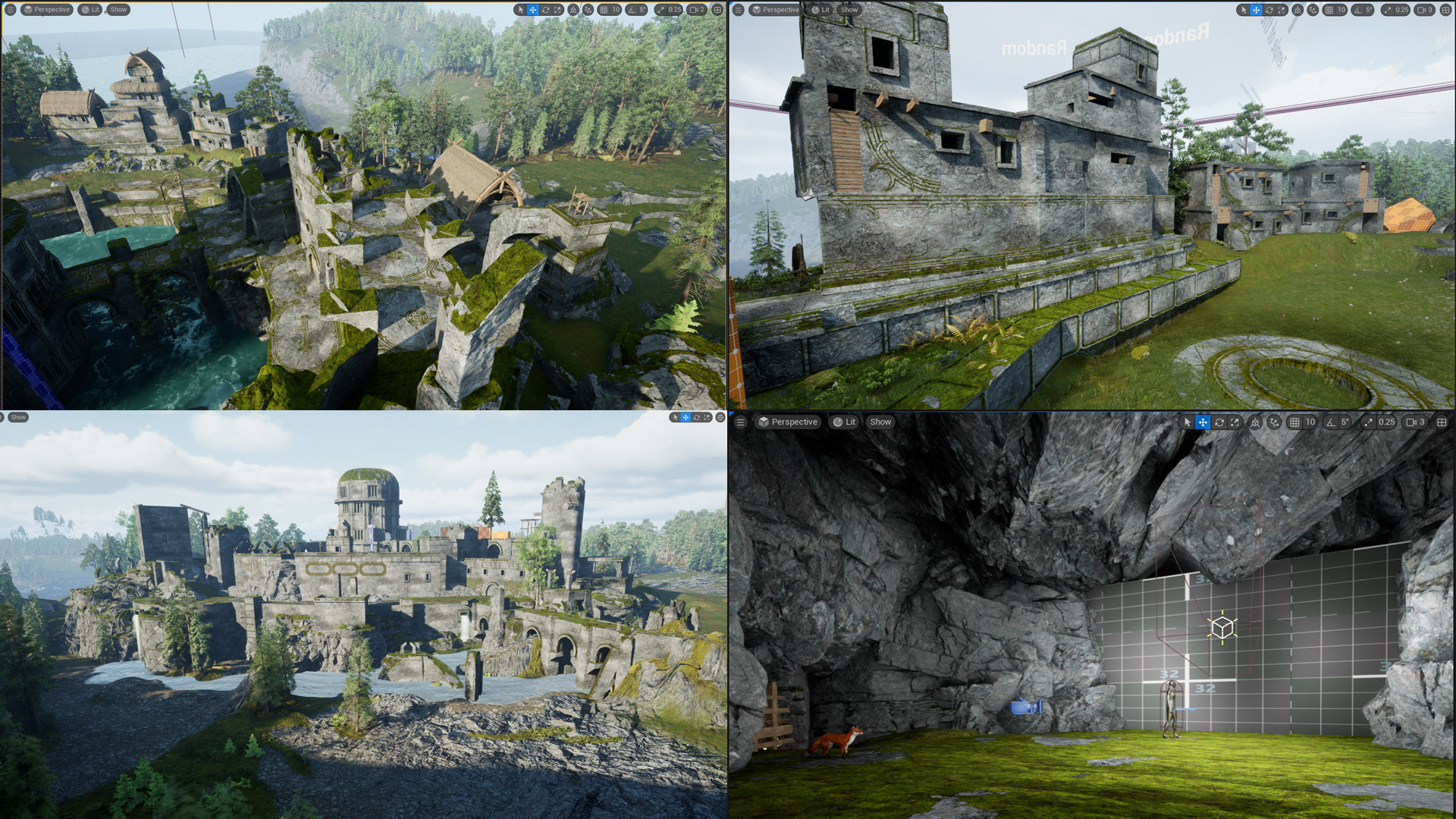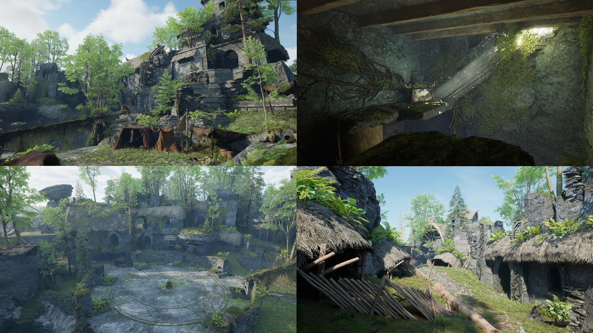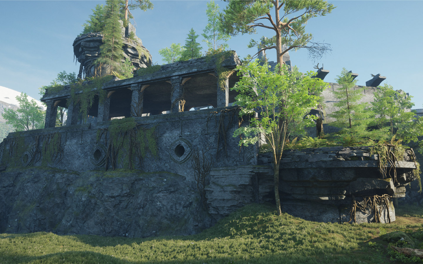 Set dressing with foliage, vines, ivy, destruction passes, landscape polish came after.