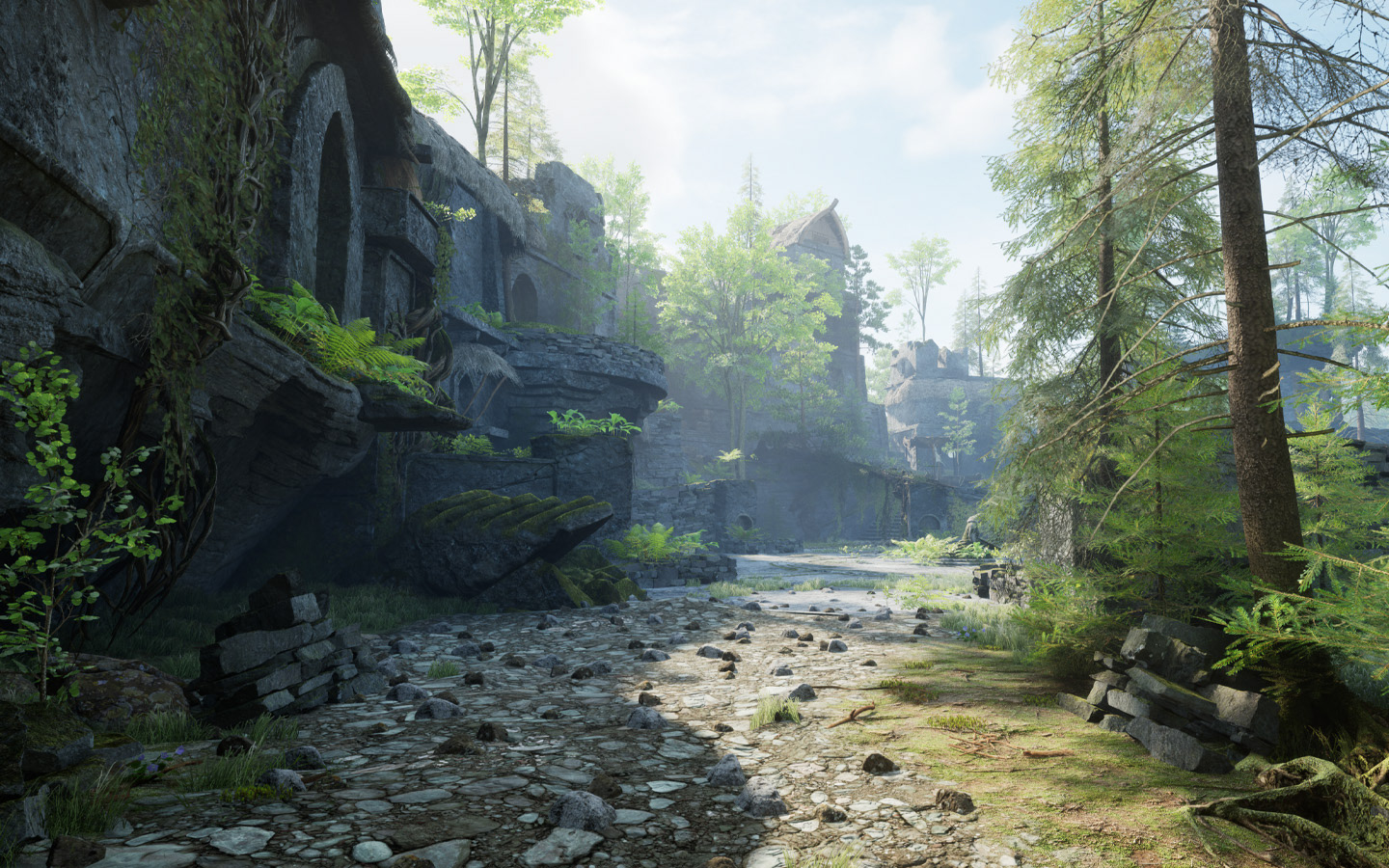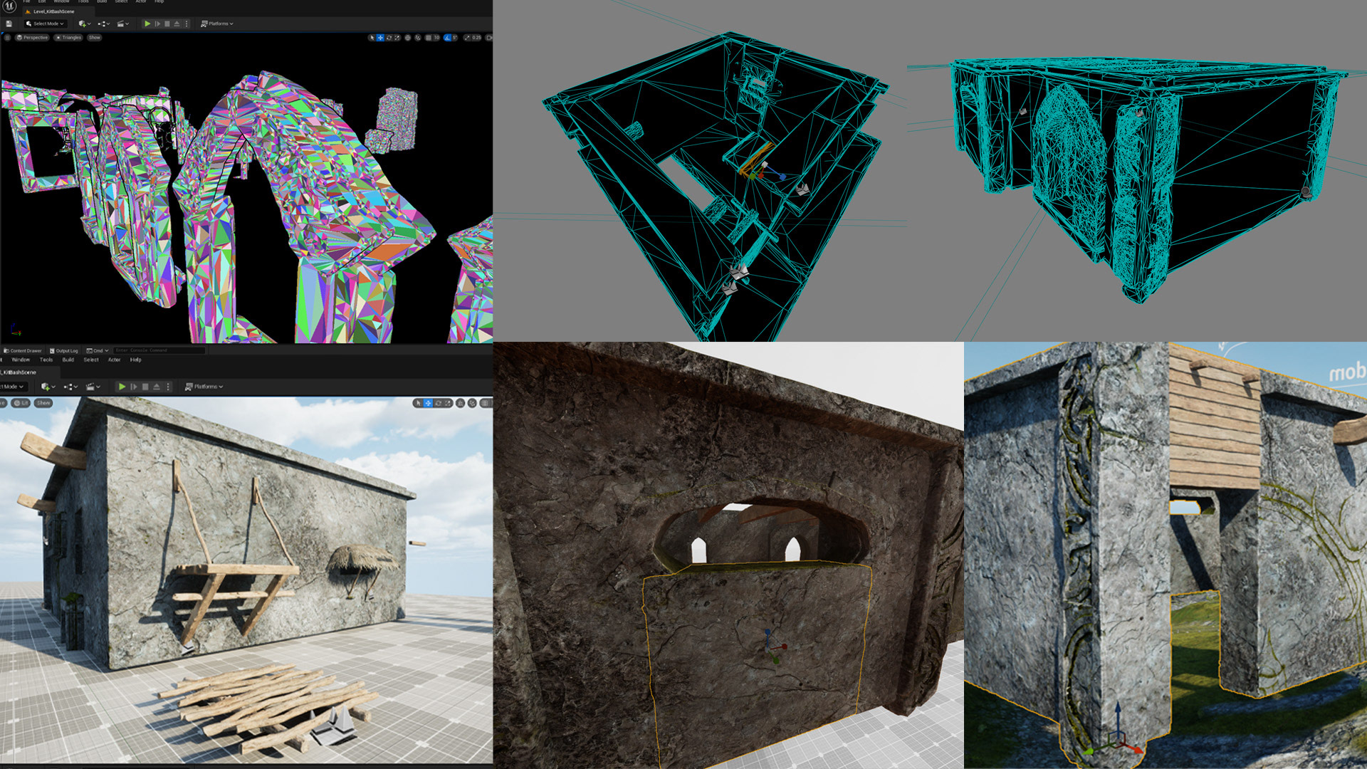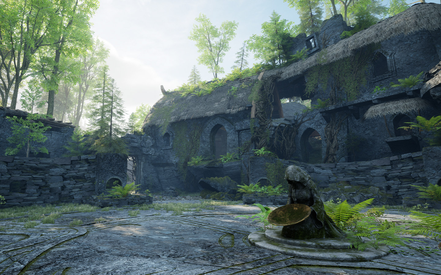 Set dressing with foliage, vines, ivy, destruction passes, landscape polish came after.