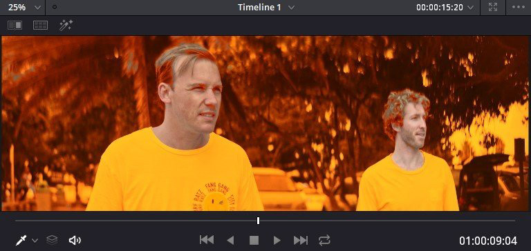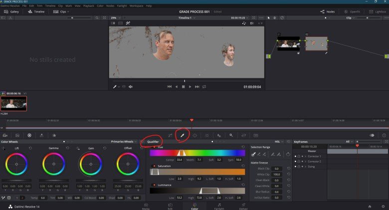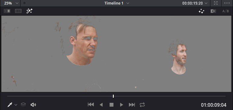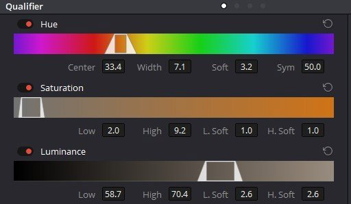 Using the qualifier tool, I've selected the skin from the footage. Davinci automatically tries it's best to get just the color you are picking with the tool.