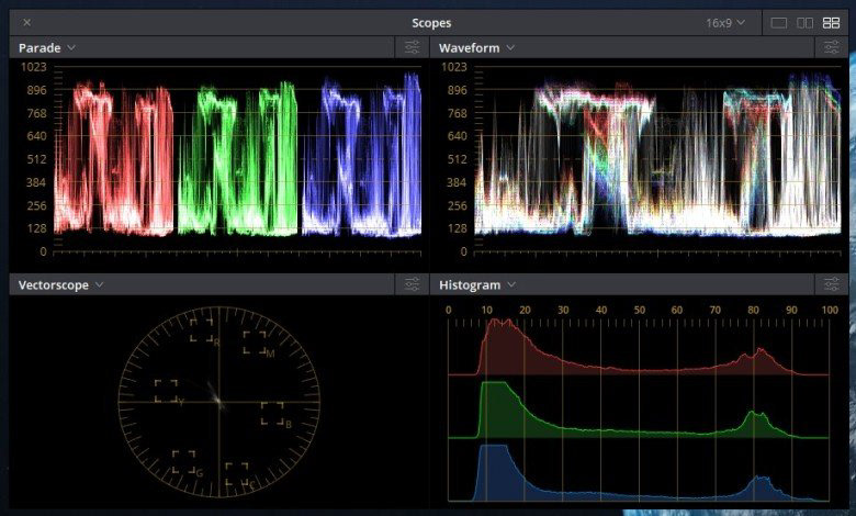 Davinci window with various scopes. It's imperative for me to refer to scopes as I adjust anything to do with the image. If you even have a rough idea of what all these graphs mean, you will make very good use of them as you work.