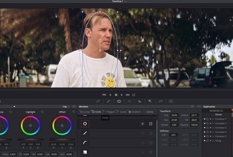 After I'm happy with the general tone and saturation of the image, I bring in power windows. This is to select a general area of the image I want to emphasize. In this case it's the characters. I can apply sharpen or any other effects to a selected area of the video using power windows.