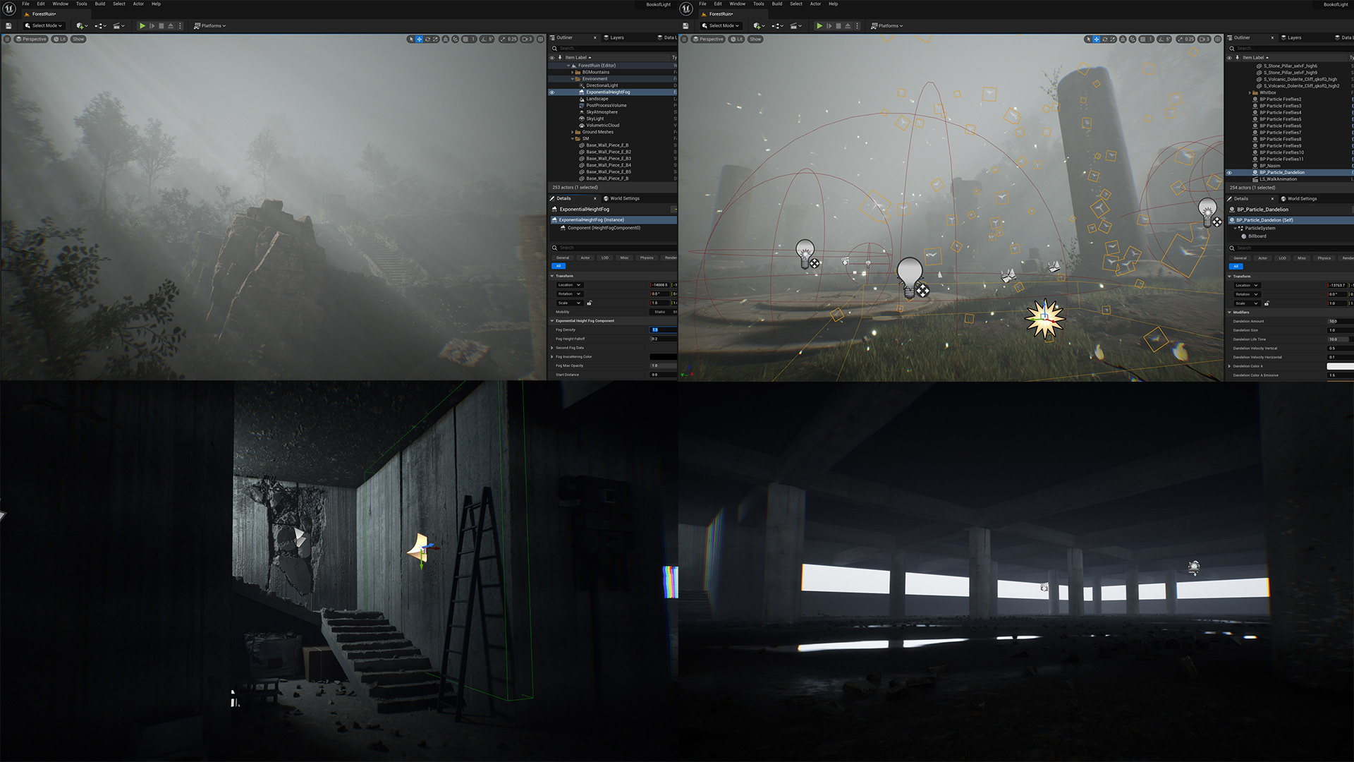 Over multiple tutorial videos I showed the process of setting up atmosphere, fog, lighting, ambient particle effects, set dressing meshes, decals, painting puddles etc.