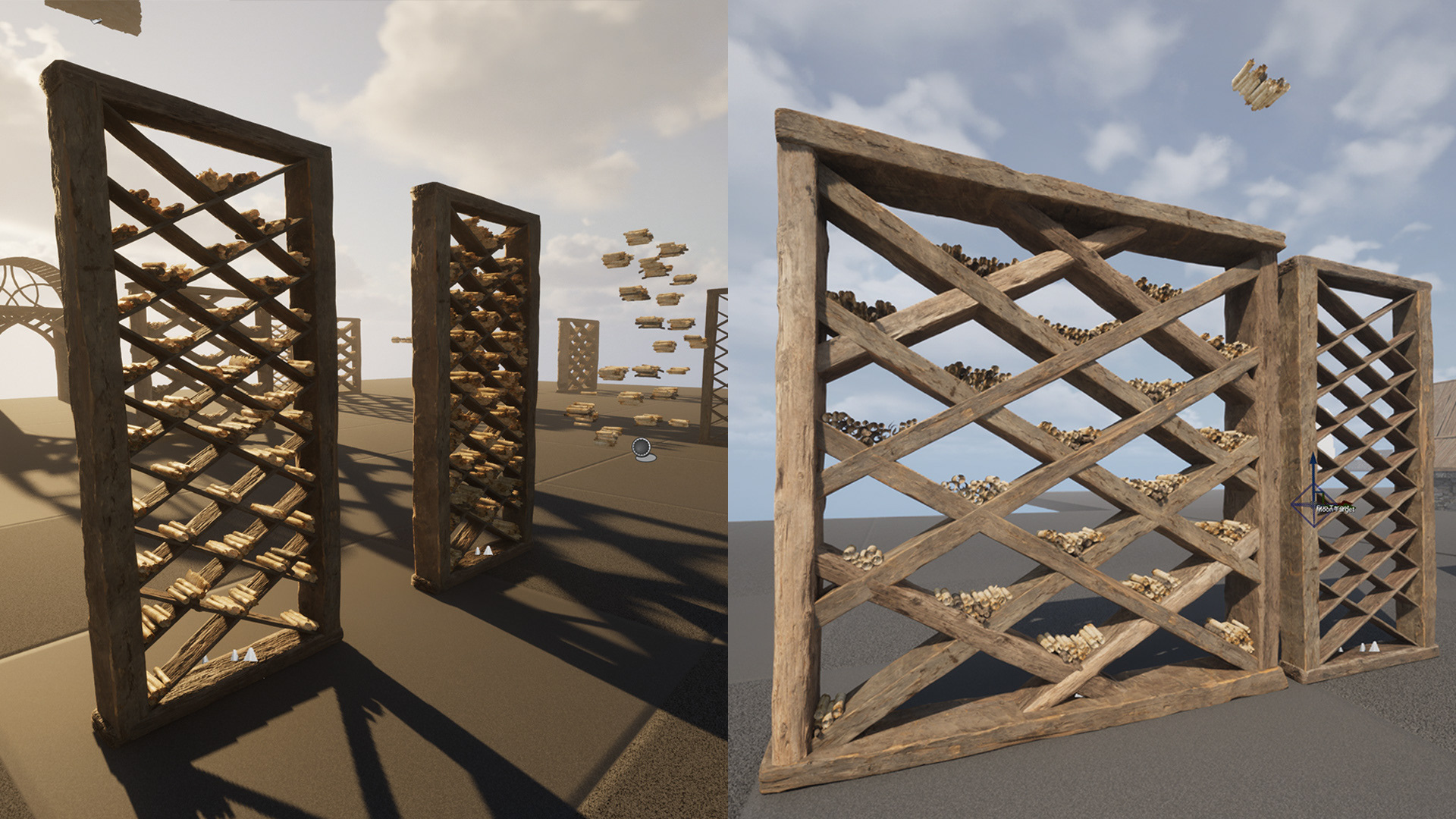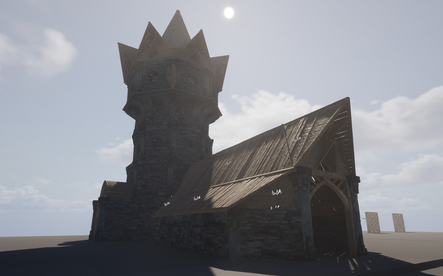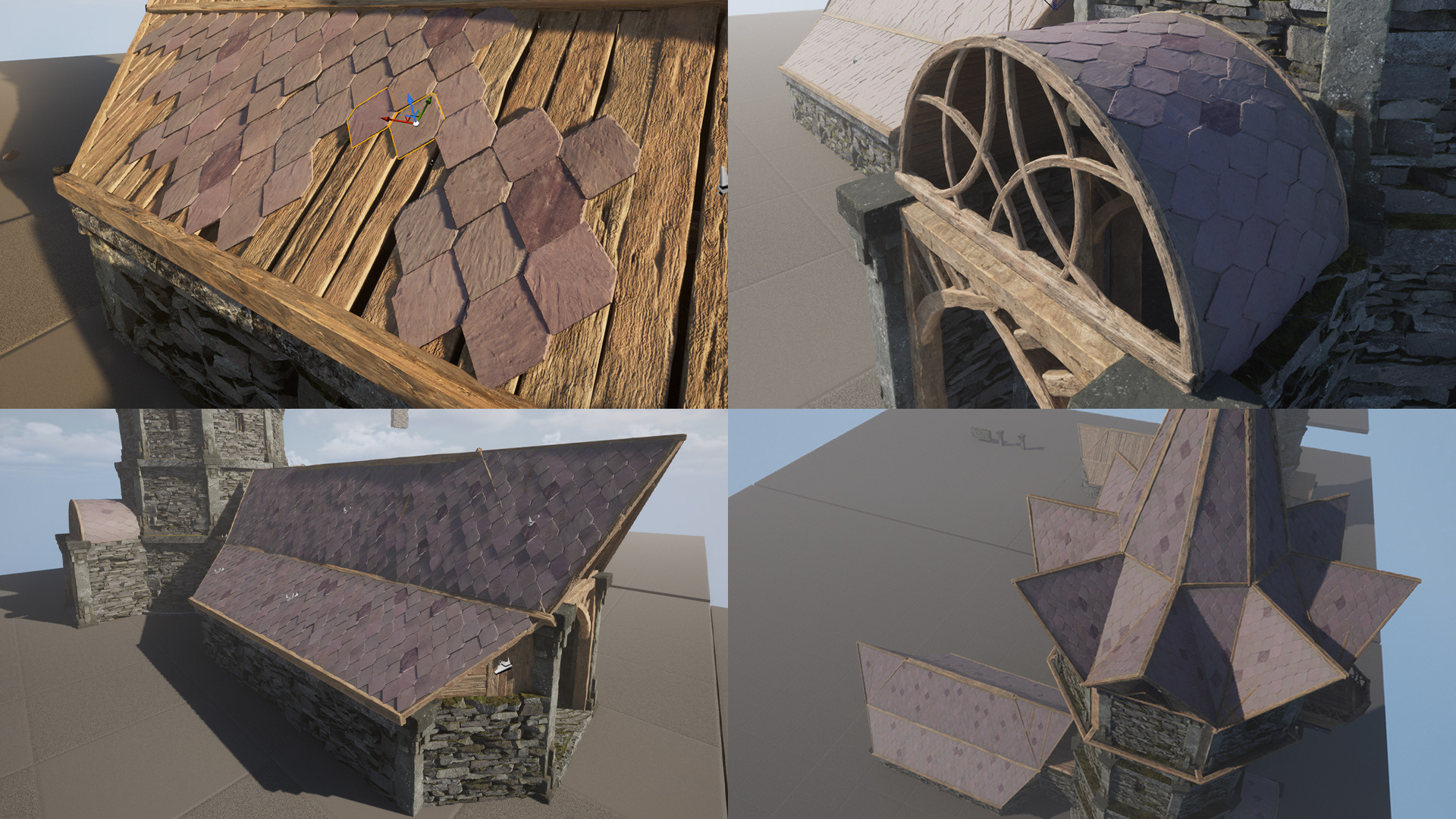 Roof tile assets were taken from elsewhere. I edited the material so that I could variate the tone and colour via primitive data. This is more performance friendly and practical than having to have a material instance for every colour and tone.