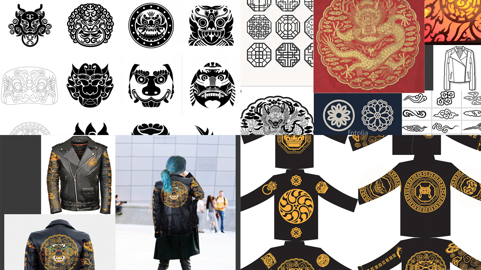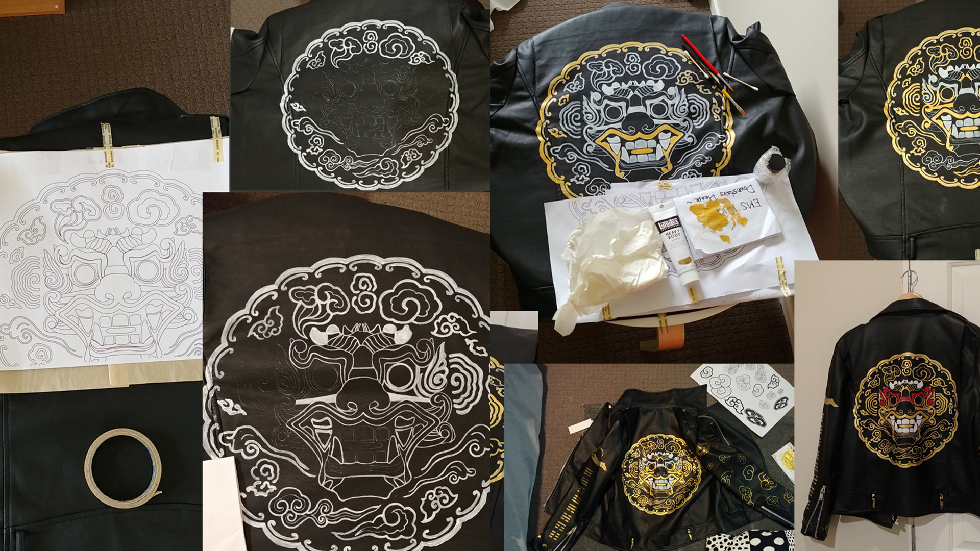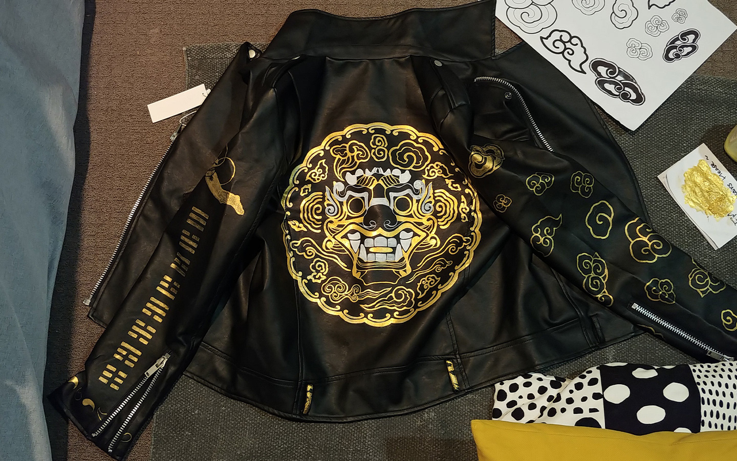 I actually wanted the patterns embroidered or printed on the jacket initially but after considering the price, print quality etc, I decided to just hand paint it.