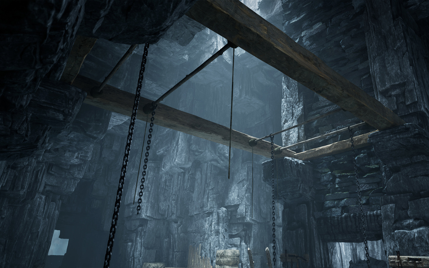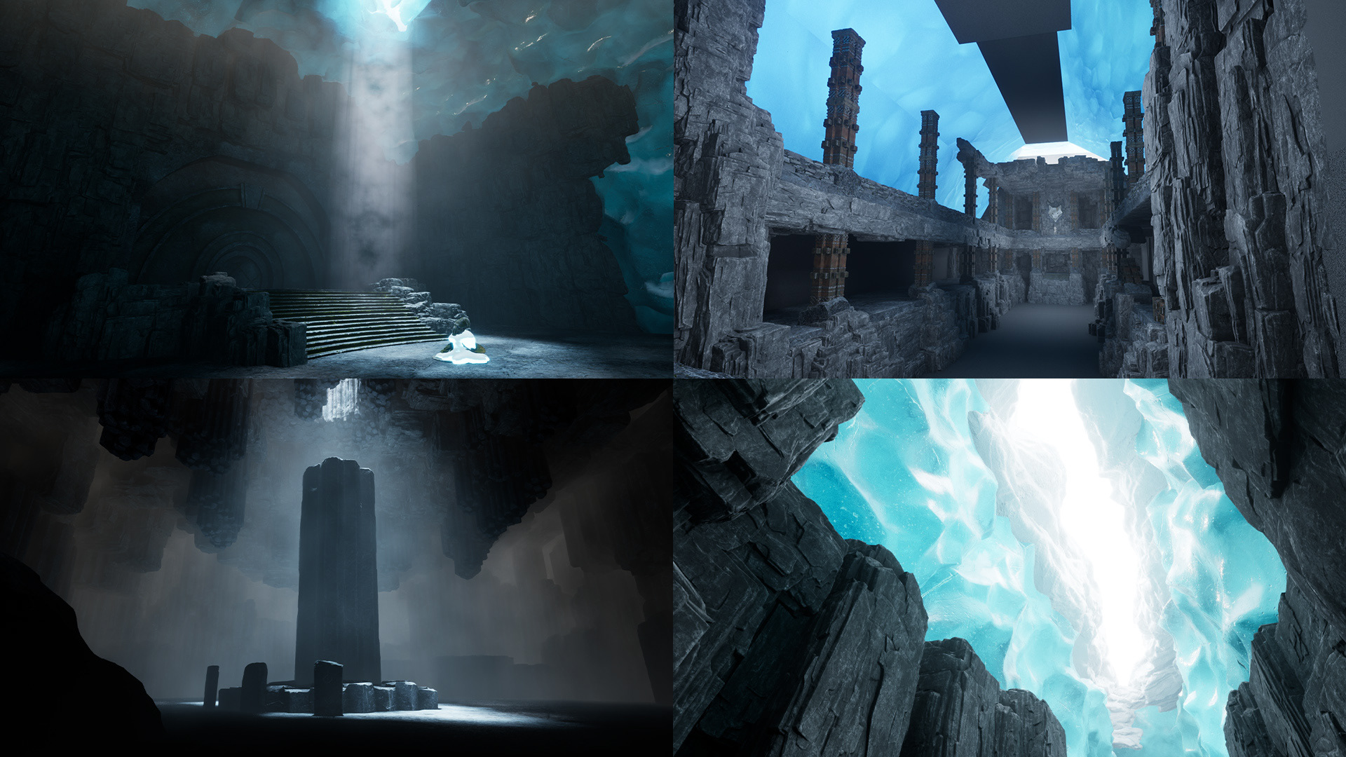 A combination of ice, stone, snow were used to portray a sunken city hidden under the mountain glacier.