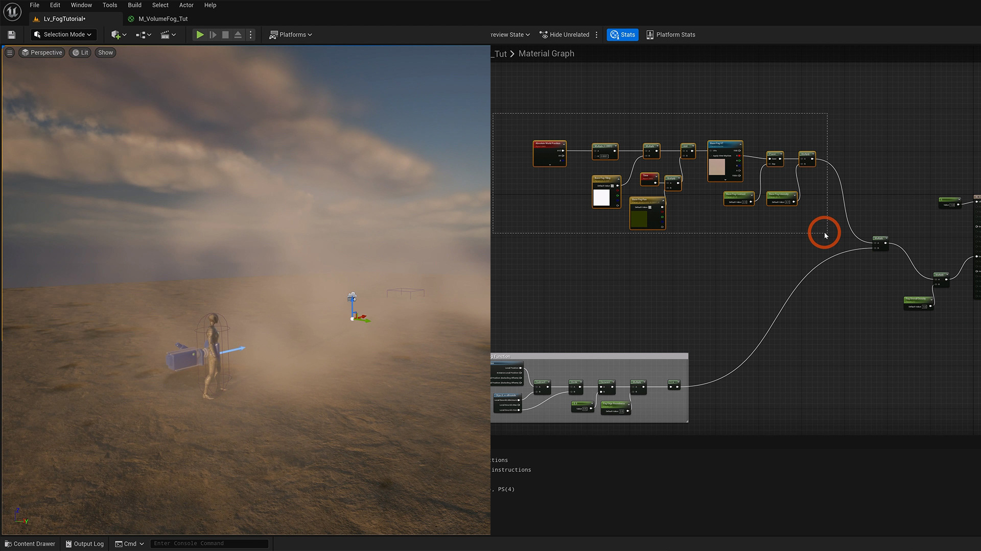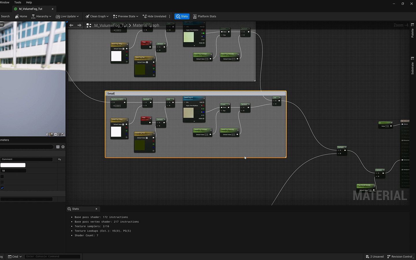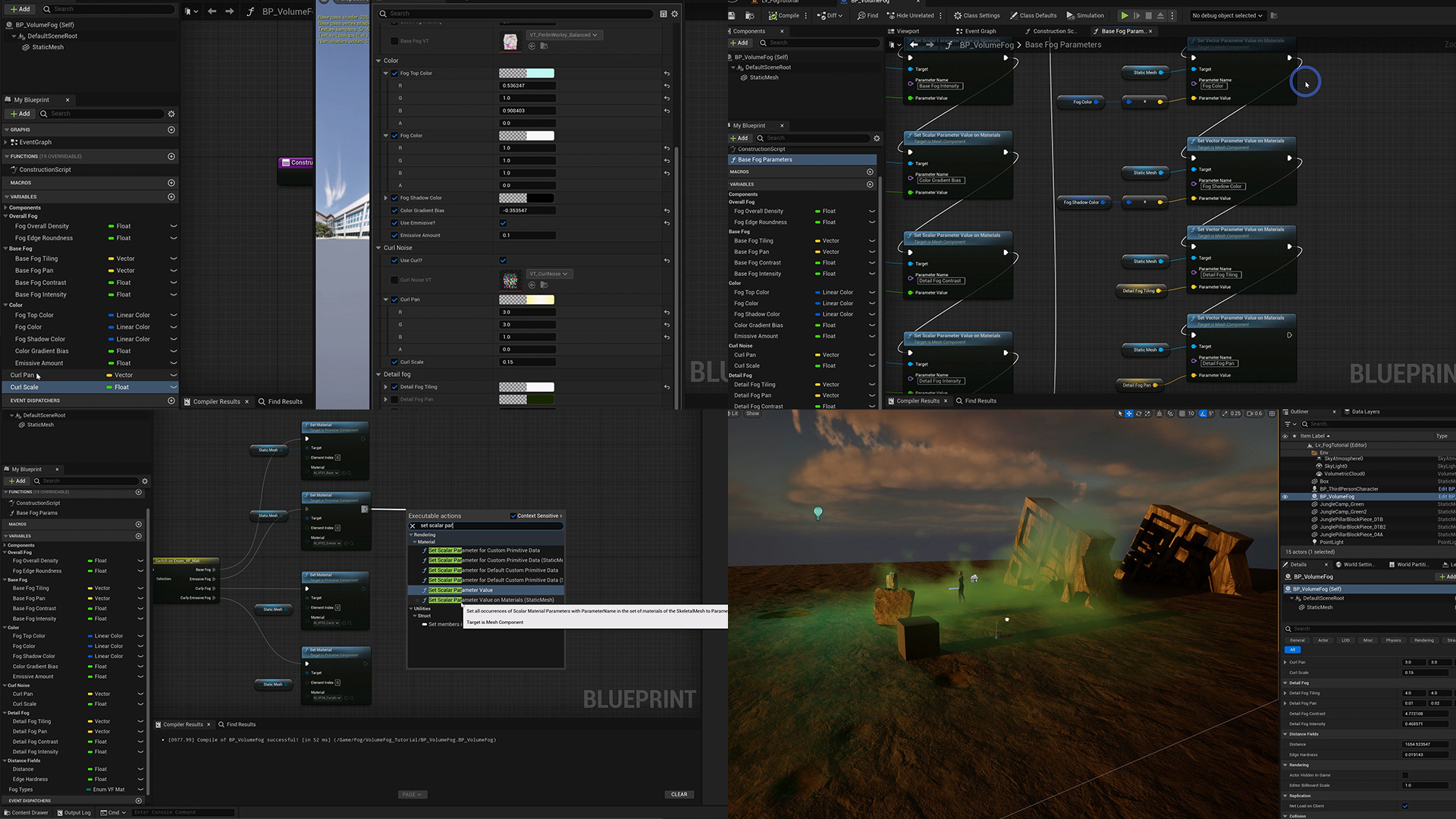 After setting up the volume fog material, all the different parameters - like how big the cloudy bits are, how dense the fog is etc - can be controlled via the material instance.
